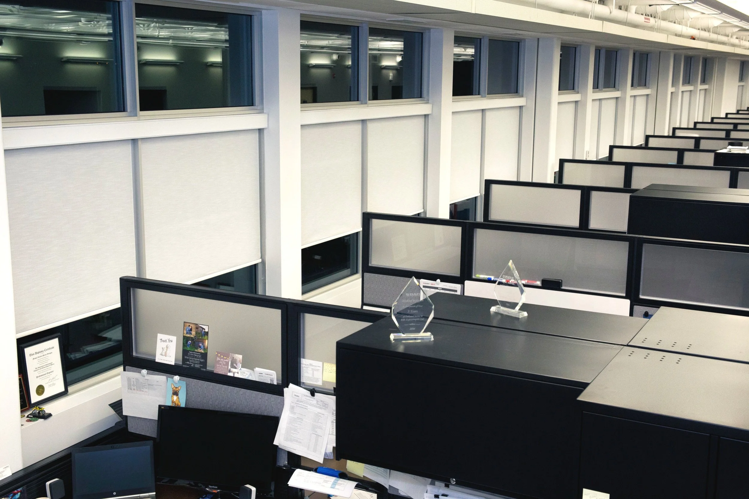 BAR Engineering has designed a new two story office facility to now call home. Gorgeous windows fill the building with natural light, but we all know our lovely sun has the ability to hinder the view of a computer screen. BAR has gone with a light filtering Roller Shade with a continuous valance. In order to maximize the amount of natural light entering the building, we have split the large windows into 4 separate rolls. When the Roller Shades are not in use they hide discreetly behind the valance, allowing for maximum visibility and natural light.