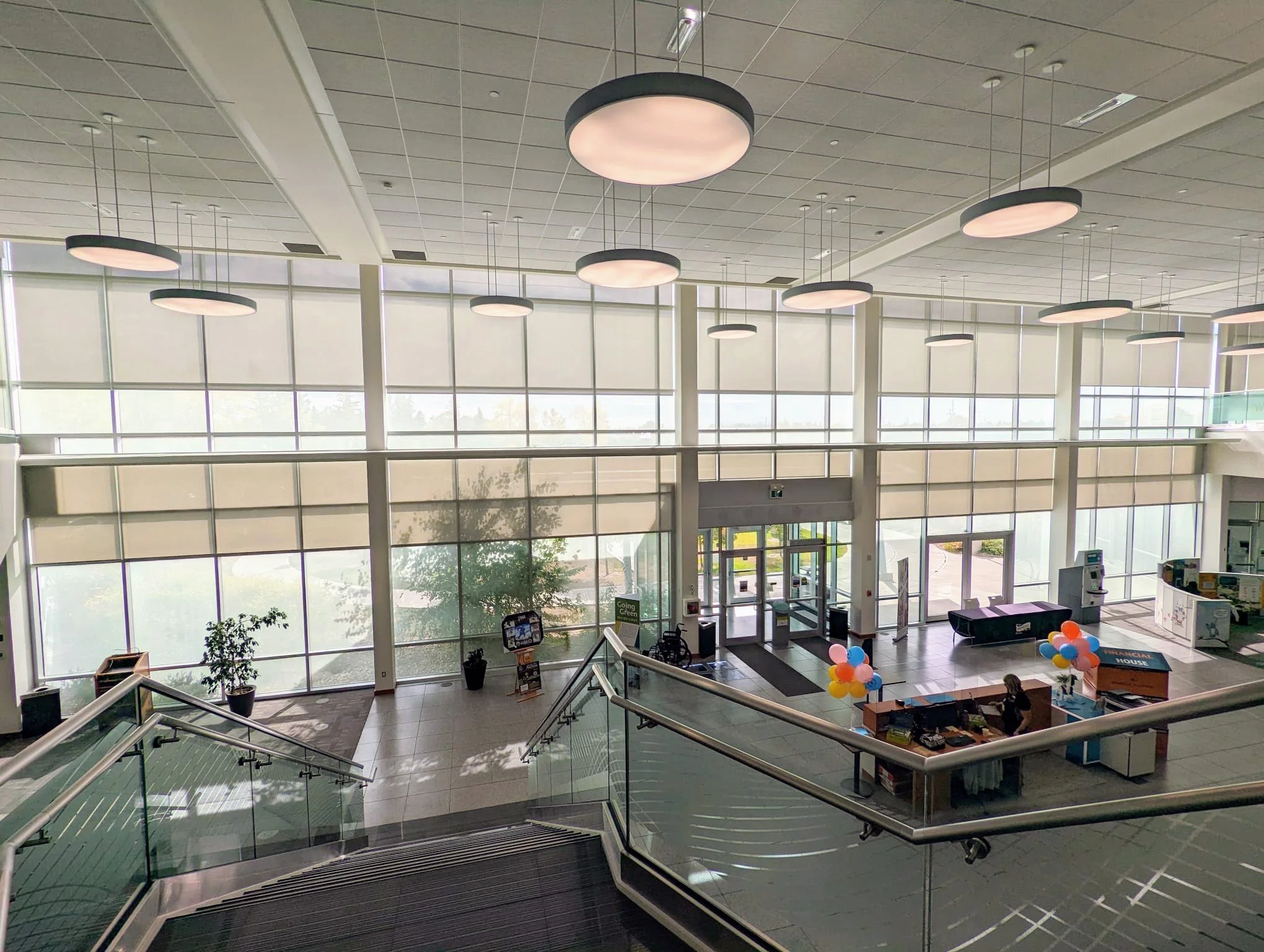 The entrance to the new Synergy Credit Union building is both beautiful and grand! We had the pleasure of providing the second stage window coverings for their south facing entry windows. South facing windows are amazing for illuminating a space and providing consistent natural light, however, this can also provide challenges. The sun can be blinding and cause glare on computer screens, which is where our screenweave rollers come in. They provide relief for the tellers from the glaring sun while allowing everyone to enjoy the beautiful light on a muted scale.